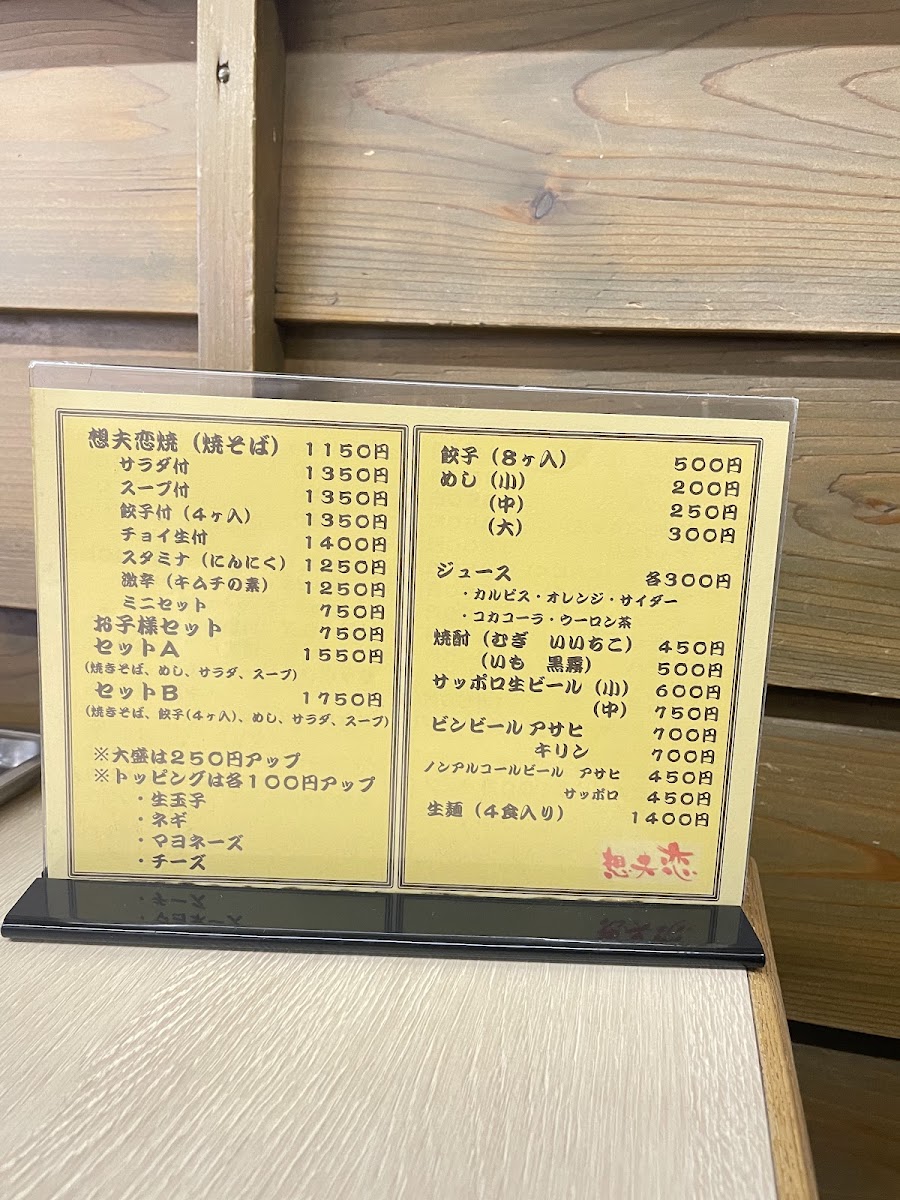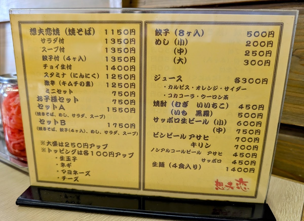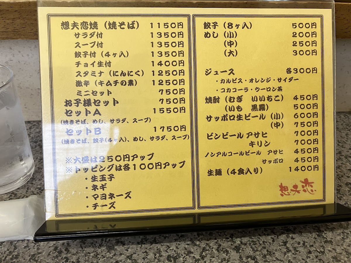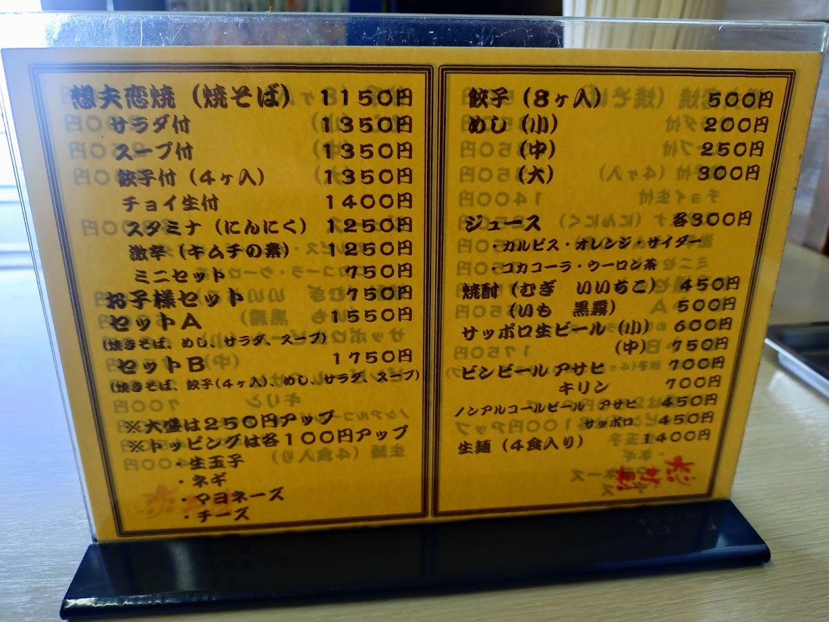 The menu at Sofuren Sanbonmatsu (Ten) feels focused and satisfying, built around hearty Hita-style flavors and easy-to-pair set options. The star of the lineup is clearly すたみな焼きそば / スタミナ焼きそば, a stamina-style fried noodle dish that comes across as the restaurant’s signature comfort pick-bold, filling, and made for anyone who wants a full meal rather than a light bite. If you want to sample the shop’s character in a smaller, more approachable way, 1口食べた日田焼きそば works well as a “first taste” option that still keeps the identity of the house style. For side dishes, 一口餃子 adds a quick, snackable contrast to the noodles, making it an easy add-on to round out the table. Set lovers have clear choices with bセット and B Set Salad, which help balance the meal and make ordering straightforward, while 想夫恋焼セットのスープ plays the supporting role that completes the set experience. For diners who like their meal with a casual drink pairing, 想夫恋焼きと瓶ビール stands out as a simple, satisfying combo that leans into the “classic Japanese meal” feeling. Families are also clearly considered with 想夫恋焼お子様セット, a kid-friendly option that makes the menu feel welcoming rather than strictly adult-oriented. Overall, the menu reads as practical and well-structured: signature noodles at the center, compact sides and salads for variety, and sets that make it easy to order confidently.