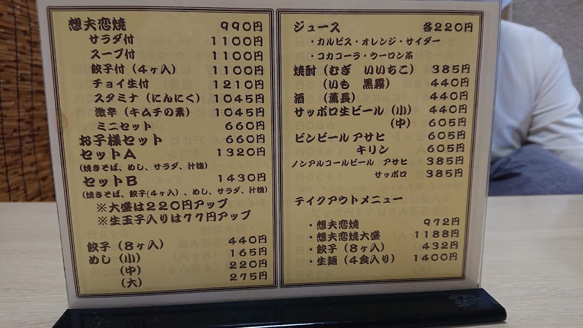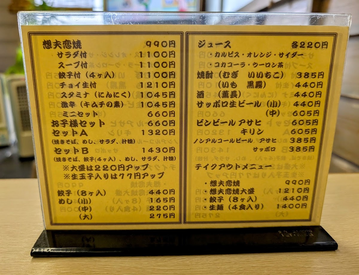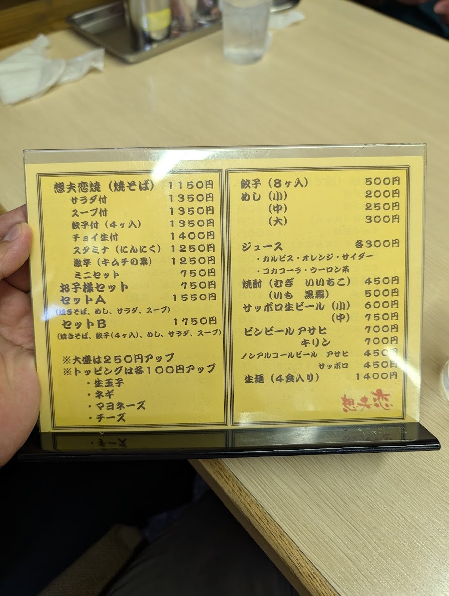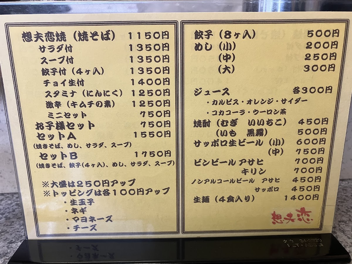 The menu at Sofuren Sanbonmatsu (Ten) feels focused and satisfying, built around hearty Hita-style flavors and easy-to-pair set options. The star of the lineup is clearly すたみな焼きそば / スタミナ焼きそば, a stamina-style fried noodle dish that comes across as the restaurant’s signature comfort pick-bold, filling, and made for anyone who wants a full meal rather than a light bite. If you want to sample the shop’s character in a smaller, more approachable way, 1口食べた日田焼きそば works well as a “first taste” option that still keeps the identity of the house style. For side dishes, 一口餃子 adds a quick, snackable contrast to the noodles, making it an easy add-on to round out the table. Set lovers have clear choices with bセット and B Set Salad, which help balance the meal and make ordering straightforward, while 想夫恋焼セットのスープ plays the supporting role that completes the set experience. For diners who like their meal with a casual drink pairing, 想夫恋焼きと瓶ビール stands out as a simple, satisfying combo that leans into the “classic Japanese meal” feeling. Families are also clearly considered with 想夫恋焼お子様セット, a kid-friendly option that makes the menu feel welcoming rather than strictly adult-oriented. Overall, the menu reads as practical and well-structured: signature noodles at the center, compact sides and salads for variety, and sets that make it easy to order confidently.